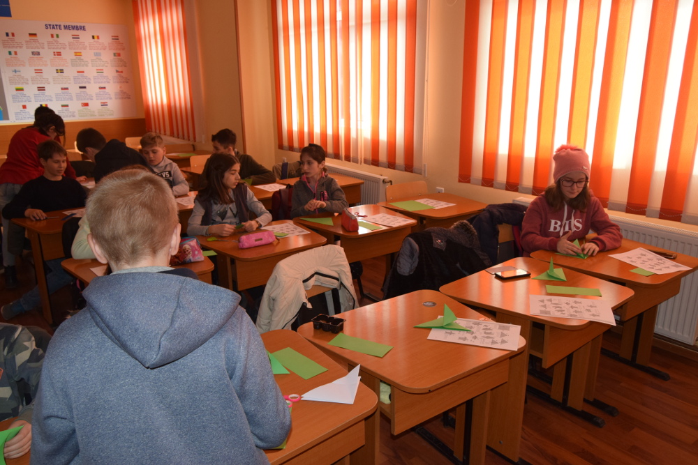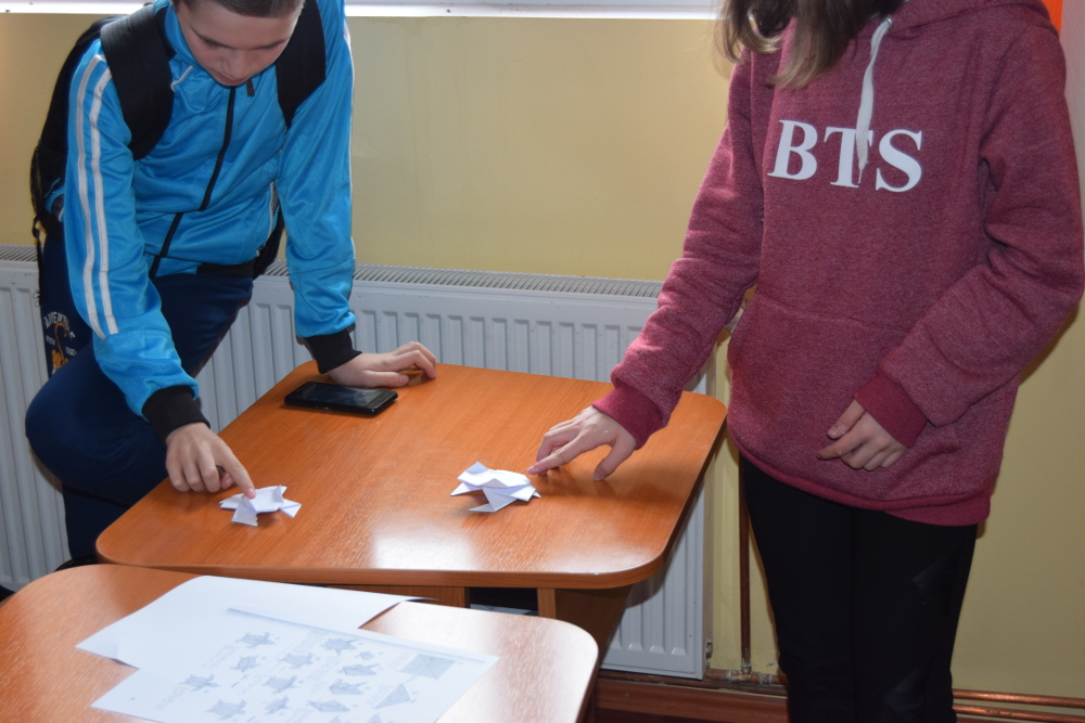 Figurinele au fost realizate prin tehnica origami, folosind hârtie tip origami (21 cm x 21 cm), punand la dispozitia elevilor schite de lucru si videoproiectii si demonstrand practic pasii de lucru tuturor elevilor.